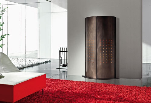 Металлический полувстроенный камин в современном стиле с открывающимися дверцами. Эффект состаренной бронзы. Материал изготовления: met. ante apribili, ottonato antic.